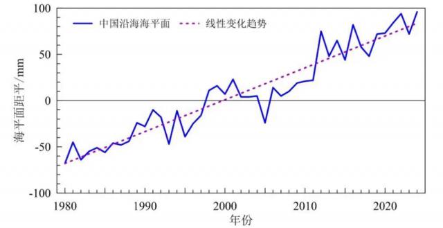 1980-2024 年,我国沿海海平面高度相对 1993-2011 年平均值的差值 ( 距平 ) 变化。图片来源:国家气候中心