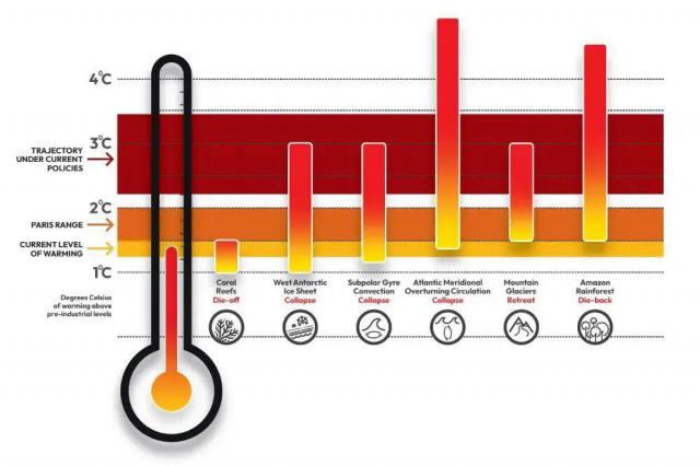 目前,科学界已识别出 16 个重要的气候临界点,例如格陵兰冰盖崩塌、亚马孙雨林退化、永久冻土解冻、珊瑚礁大规模白化等。这些临界点被触发的可能性,与全球气温上升的幅度紧密相关。