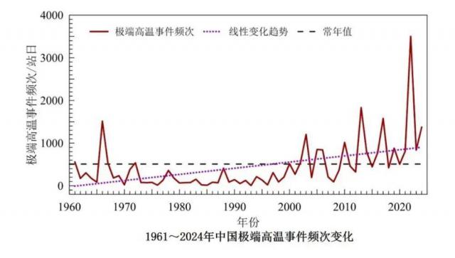 1961-2024 年中国极端高温事件的频次变化时间序列。图源:国家气候中心