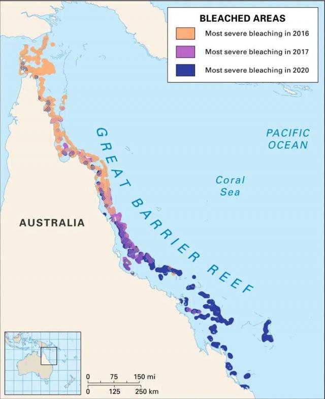 大堡礁在 2016-2020 年多次海洋热浪影响下的白化危机。图片来源:美国海洋与大气管理局
