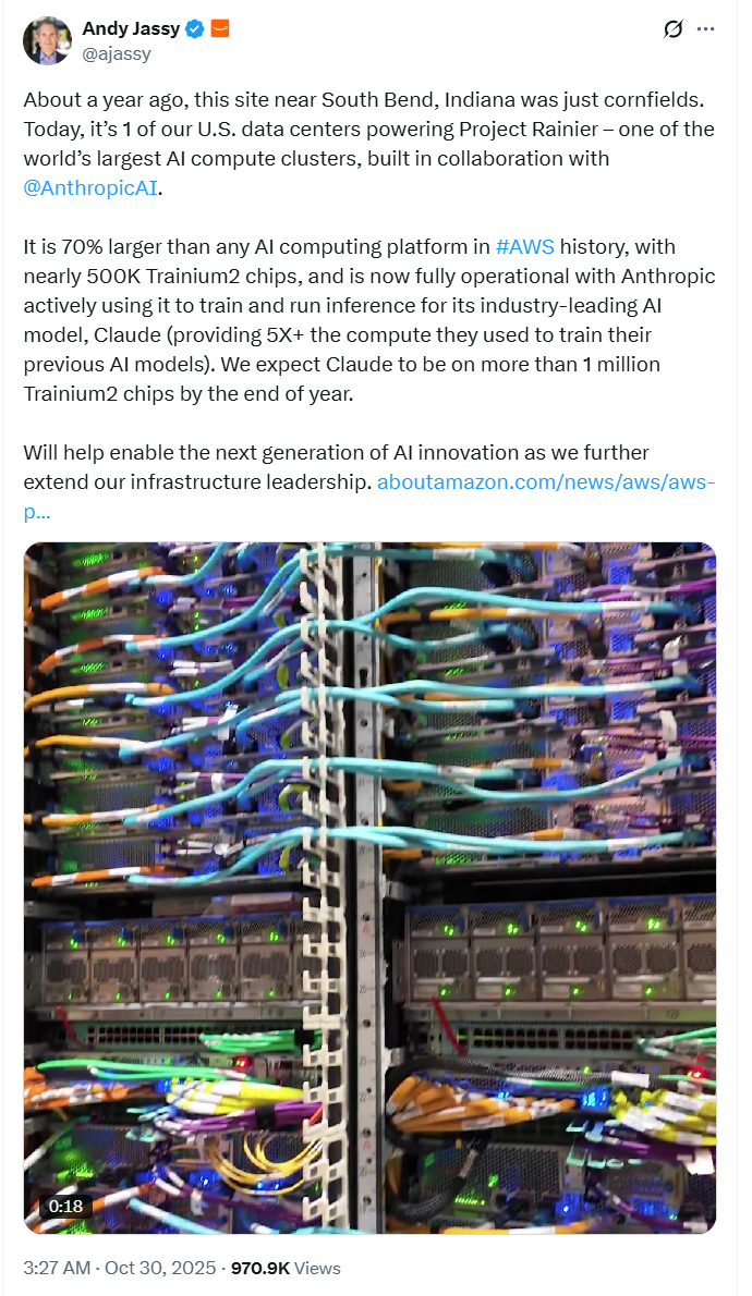 据华尔街见闻文章,亚马逊AWS建造的Project Rainier核心数据中心已全面投入运行,目前正在为Anthropic训练Claude大模型。该系统部署了近50万颗Trainium 2芯片(预计年底翻番至100万颗),是全球最大的AI训练计算机之一。